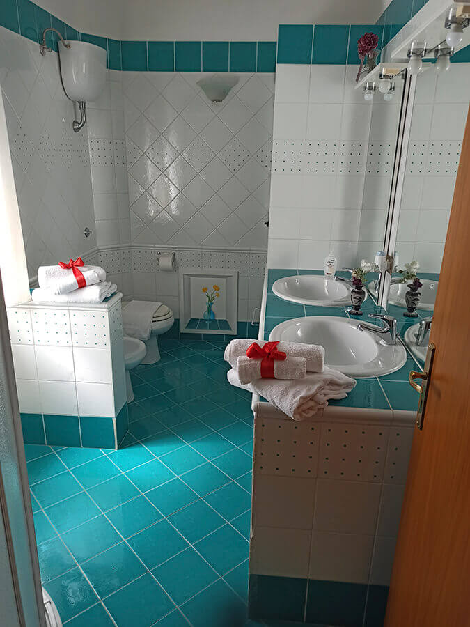 L'ampio bagno privato è dotato di doccia, bidet, due lavabi e comodi spazi. Troverete un set di asciugamani in spugna, l’asciugacapelli, e ottimi saponi per donare al vostro corpo profumo e morbidezza.